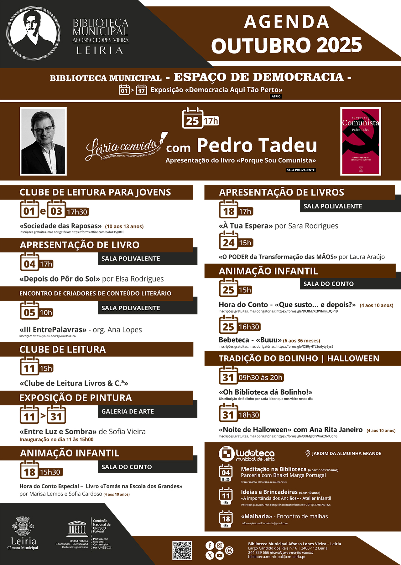 Conheça a programação da Biblioteca Municipal Afonso Lopes Vieira, em Leiria, para o mês de outubro de 2025.