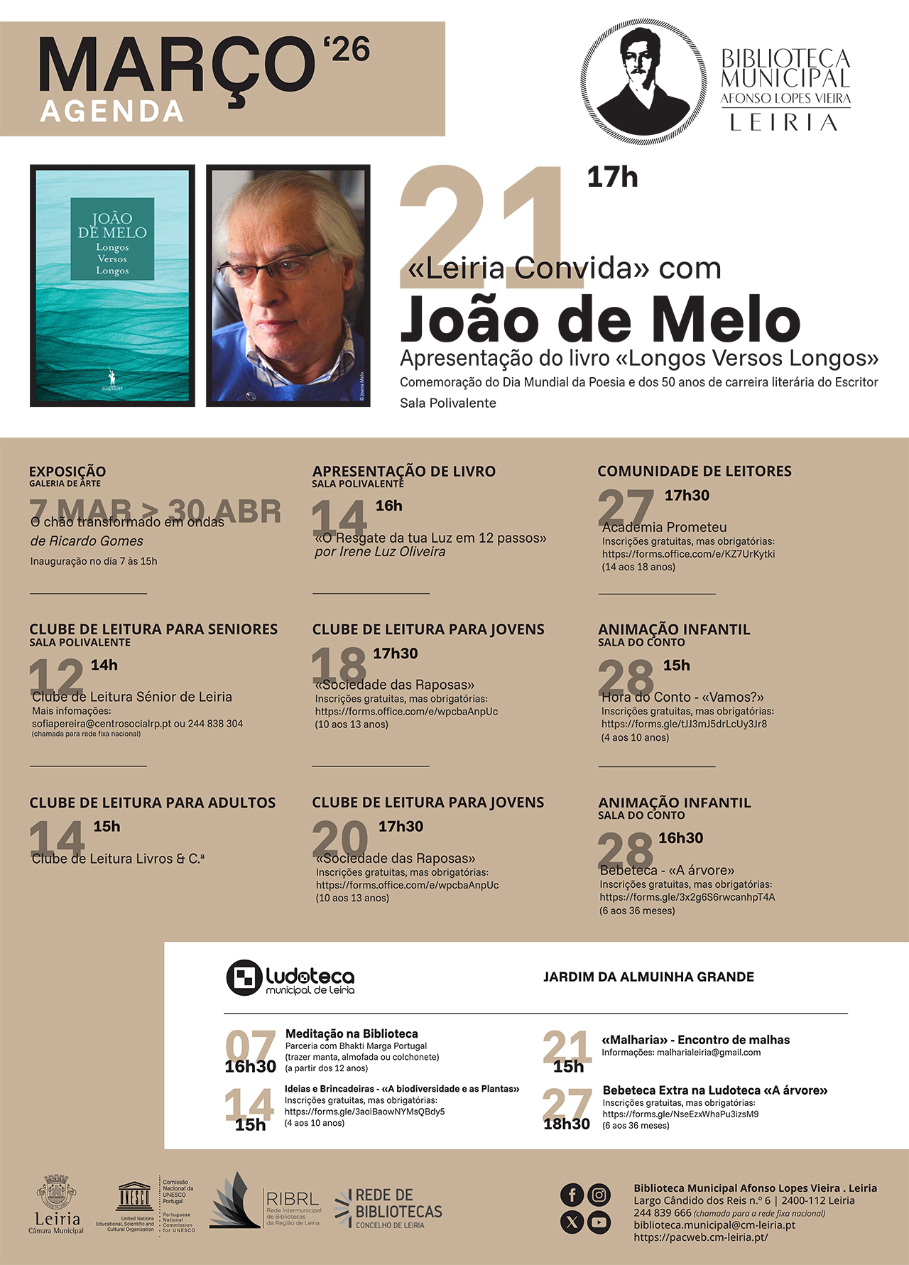 Conheça a programação da Biblioteca Municipal Afonso Lopes Vieira, em Leiria, para o mês de março de 2026.